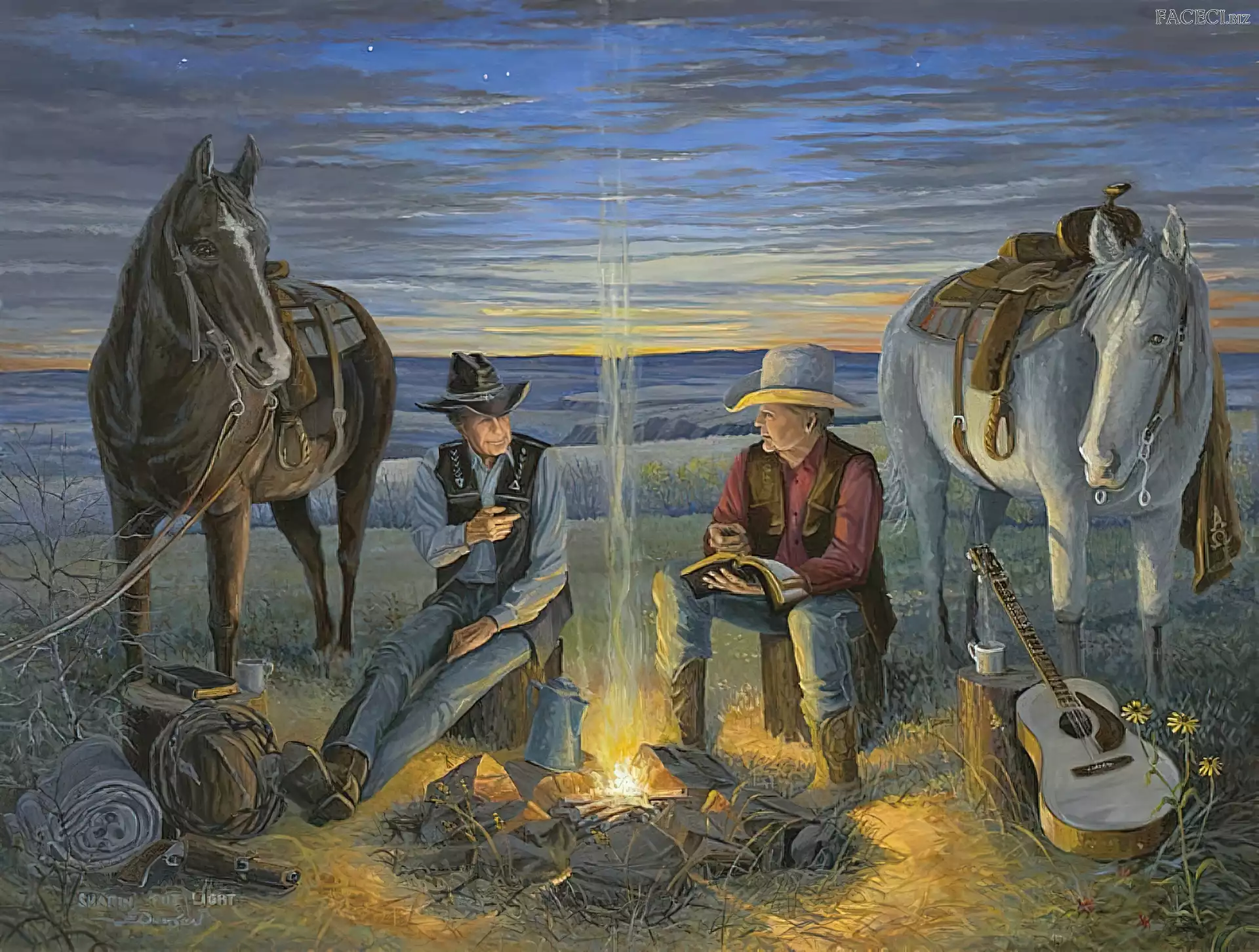 Gitara, Ognisko, Noc, Kowboje, Konie - faceci.biz